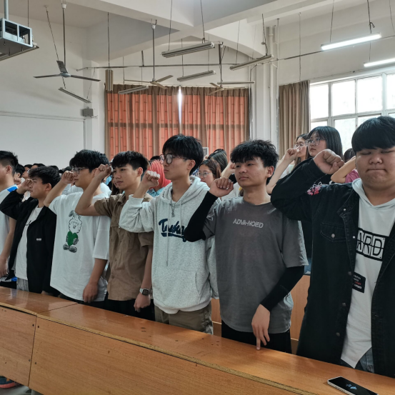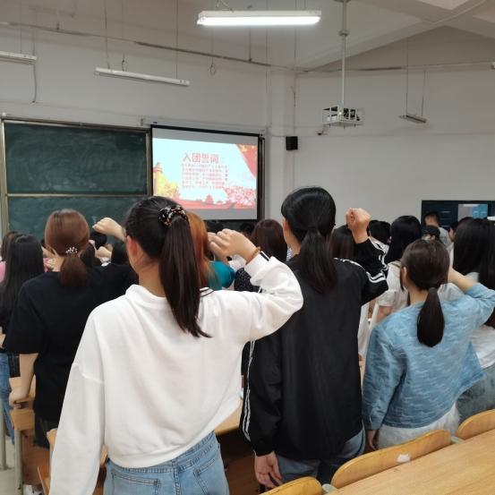 在团歌渲染的庄严气氛中,两班团支书带领全体共青团员佩戴团徽,高举右拳,重温了入团誓词,再次接受了一次思想洗礼。“我宣誓:我志愿加入中国共产主义青年团,坚决拥护中国共产党的领导,遵守团的章程……为共产主义事业而奋斗!”的铮铮誓词震撼人心。在这庄严的时刻,每一位宣誓的老团员重新感受入团的氛围,重温了当年入团许下的神圣誓言,大家心中都感慨万分,深切地感受到作为团员的那份沉甸甸的责任。