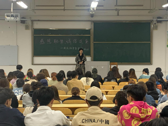 接近尾声,由贷款员工代表发言,现场互动,员工就借还款常见问题进行提问,最后,全体同学在辅导员的带领下做出了诚信还款的宣誓:“滴水之恩, 涌泉相报。我郑重承...做一个知荣辱,守诚信的人文员工。”铿锵有力的语调在教室里回荡,代表了全体同学的诚挚还款之意。