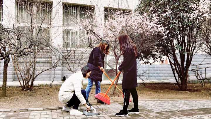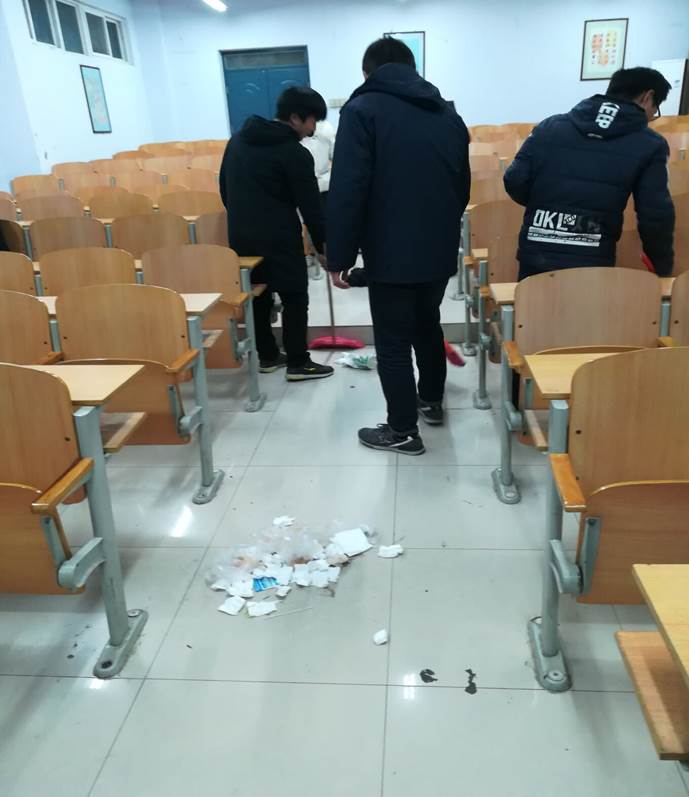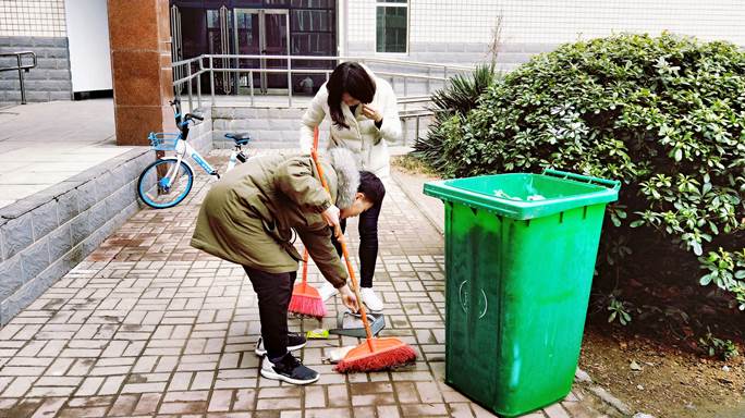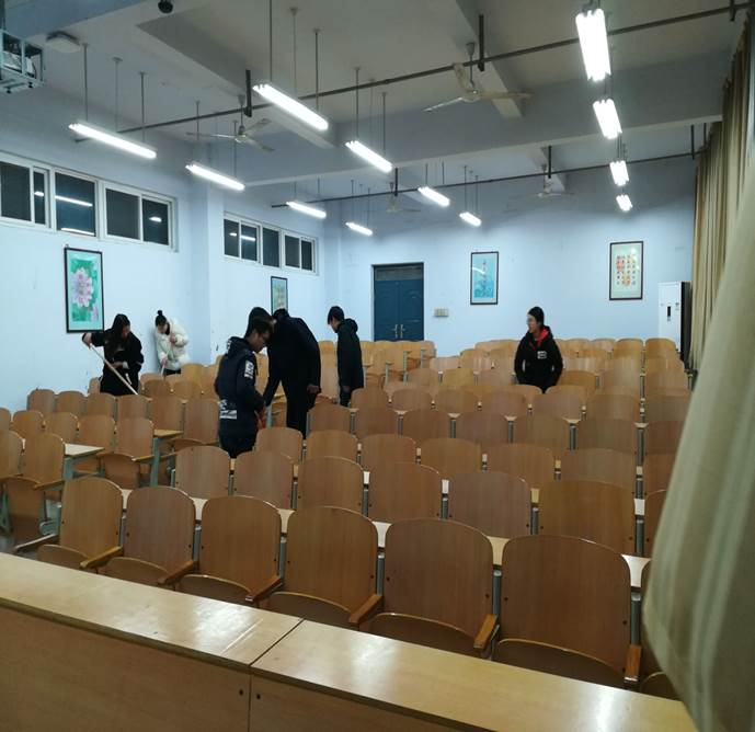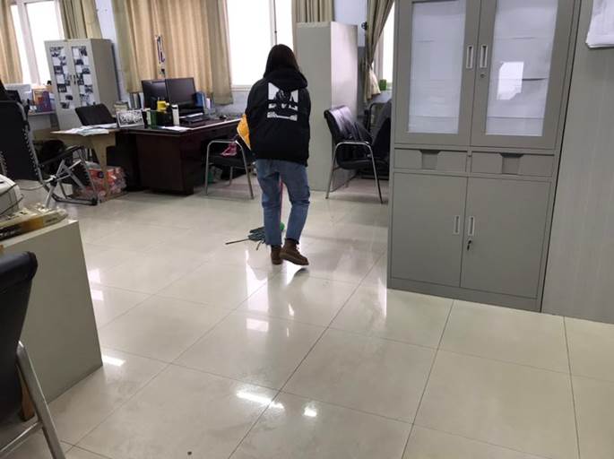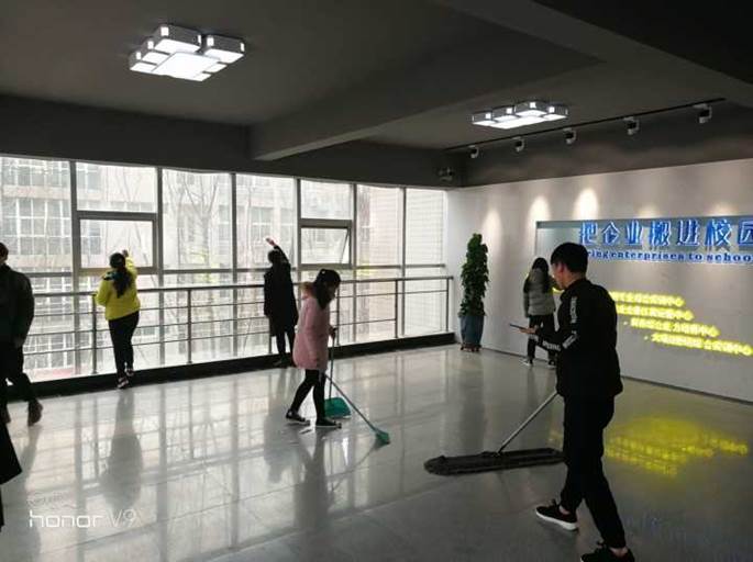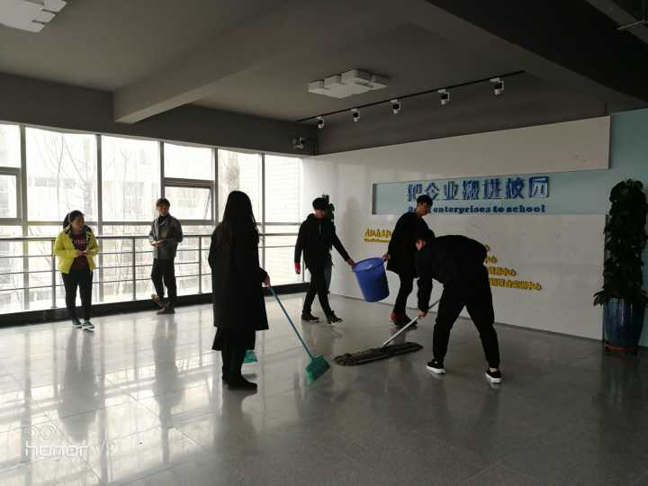 志愿者小组认真的在打扫实训楼
