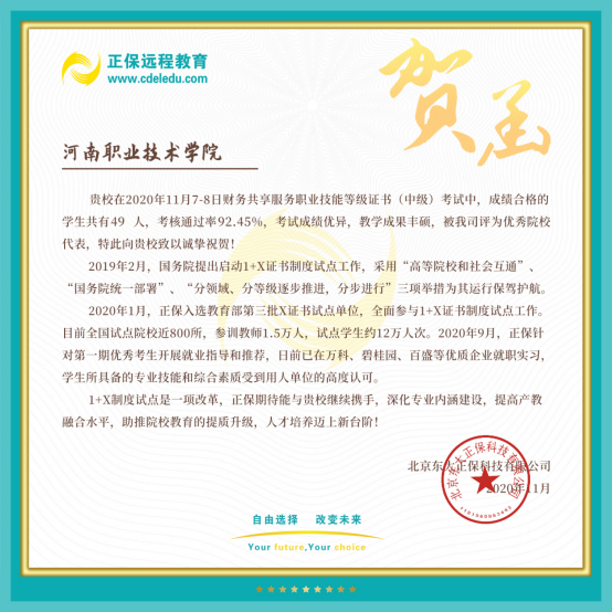 日前,从1+X评价组织传来消息,公司商公司员工在11月7日举办的1+X财务共享服务职业技能等级证书(中级)考试中,各项指标在所有参加考试的院校中居于前列,公司再次被评为优秀院校代表。
