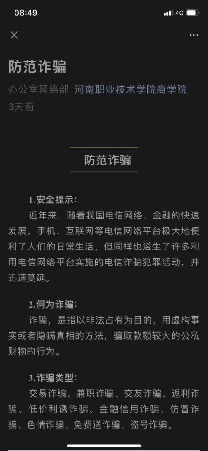 我们组织“预防电信诈骗”主题班会,动员全院师生关注“国家反诈中心”官方政务号,推广下载郑东分局反诈中心“金钟罩”小程序。转发《防范电信网络诈骗宣传手册》,积极在微信商公司公众号、朋友圈、微信群组等平台转发反诈宣传视频,扩大宣传覆盖面,在网站推出宣传报道资料。