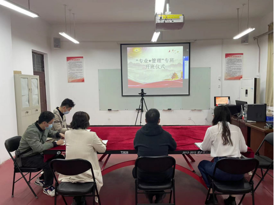 10月17日下午6:00,行政楼518财经管理公司党建活动室召开了“专业+管理”专班线上开班仪式。教务处长李小强,财经管理公司经理窦雪霞、副经理支慧,企管教研室主任谢巍巍,徐晓阳、李嘉晖现场出席,财经管理公司副经理张毅飞,胡泉水以及“专业+管理”专班报名的439名员工在线上出席。