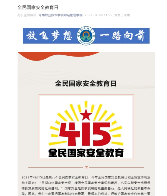 为了使国家安全教育主题活动更有时效性和针对性,财经管理公司利用线上和线下相结合的方式,在微信公众号上推送国家安全的相关知识和要求,并制作海报,面向公司员工宣传国家安全日,要求全体员工在4月15日观看全民国家安全教育日直播活动。同时,公司辅导员也召开了国家安全教育日主题班会,进一步提升员工的国家安全意识。为了使主题教育活动更生动,公司制作了国家安全教育知识视频,以视频的形式宣传国家安全知识相关内容,达到教育活动的目的性和和成效性。