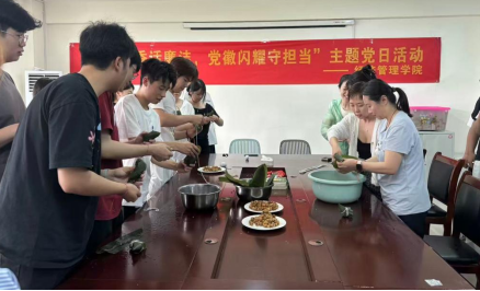 在随后的包粽子环节中,现场气氛热烈非凡。糯米、粽叶、红枣等食材整齐摆放。支部党员们热情高涨,纷纷动手参与。大家围坐在一起,互相交流包粽子的技巧。有的党员手法娴熟,动作行云流水,折叠粽叶、填装糯米、放入红枣、捆绑成型,一气呵成;有的同学则略显生疏,但在其他党员的耐心指导下,也逐渐掌握了要领,包出了一个个饱满的粽子,大家边学边做,互帮互助,欢声笑语不断。