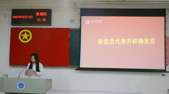 随后,新团员代表齐梓琳代表新团员发言,她表示加入共青团是一份荣誉,更是一份责任。在今后的学习和生活中,将以团员的标准严格要求自己,努力学习科学文化知识,积极参加社会实践活动,用实际行动践行入团誓言,为团旗增光添彩。老团员代表郭梦婷同学也分享了自己的成长经历,鼓励新团员们珍惜团员身份,不断提升自我,在青春的赛道上奋力奔跑,为公司发展贡献自己的力量。