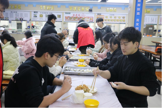 经过一个多小时的忙碌,一个个饱满圆润的饺子摆满了餐盘。随后,工作人员将包好的饺子分批放入锅中煮熟。当热气腾腾的饺子端上桌时,大家迫不及待地品尝起自己的劳动成果。咬一口鲜香四溢的饺子,暖流瞬间涌上心头。同学们互相分享美食,交流着活动中的趣事,畅谈学习与生活中的感悟,食堂内处处洋溢着温馨和谐的氛围。