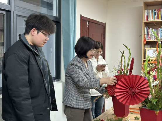 活动开始,李卫红老师以生动鲜活的语言,逐一介绍了各类花材的特质与深层花语。红瑞木的坚韧不拔、腊梅的高洁傲雪、非洲菊的热情奔放、剑兰的锐意进取、雪柳的清雅脱俗……每一种花卉都被赋予了独特的生命哲学,让老师和同学们潜移默化地接受心灵的滋养与启迪。插花创作环节,成为代际互动的温馨载体。退休教师们结合自身丰富的人生阅历,将插花艺术与生活感悟相融,手把手地指导同学们挑选花材、调整布局。同学们则以青春视角大胆创新,将对生活的热爱与对未来的期许注入作品,在老教师的点拨下不断优化构思。创作间隙,退休教师们还与同学们围坐交流,针对学业压力、职业规划、人际关系等日常困惑展开深入探讨。同学们表示,这种“以花会友”的形式既放松了身心,又收获了宝贵的人生经验。