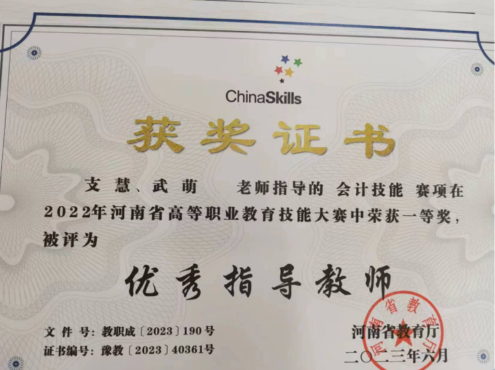 支慧、武萌老师指导的会计技能赛项在2022年河南省高等职业教育技能大赛中荣获一等奖,被评为优秀指导教师优秀指导教师。